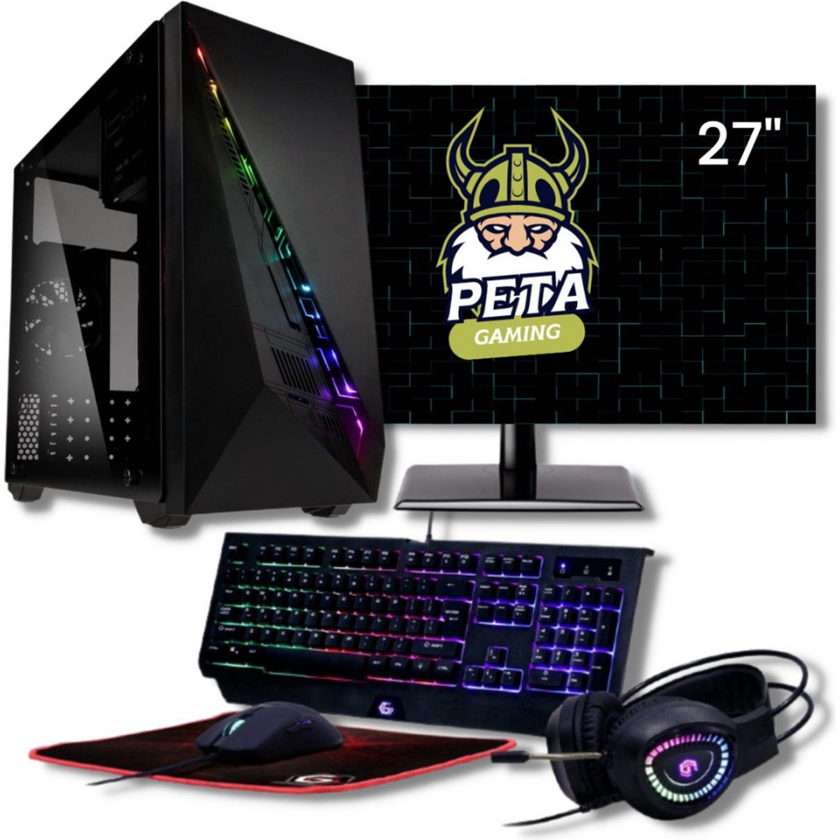 De Peta Gaming Set bevat ook een 27-inch FullHD monitor voor heldere en scherpe weergave bij 1080p-gaming. Daarnaast worden een toetsenbord en muis meegeleverd, zodat je direct kunt beginnen met gamen.